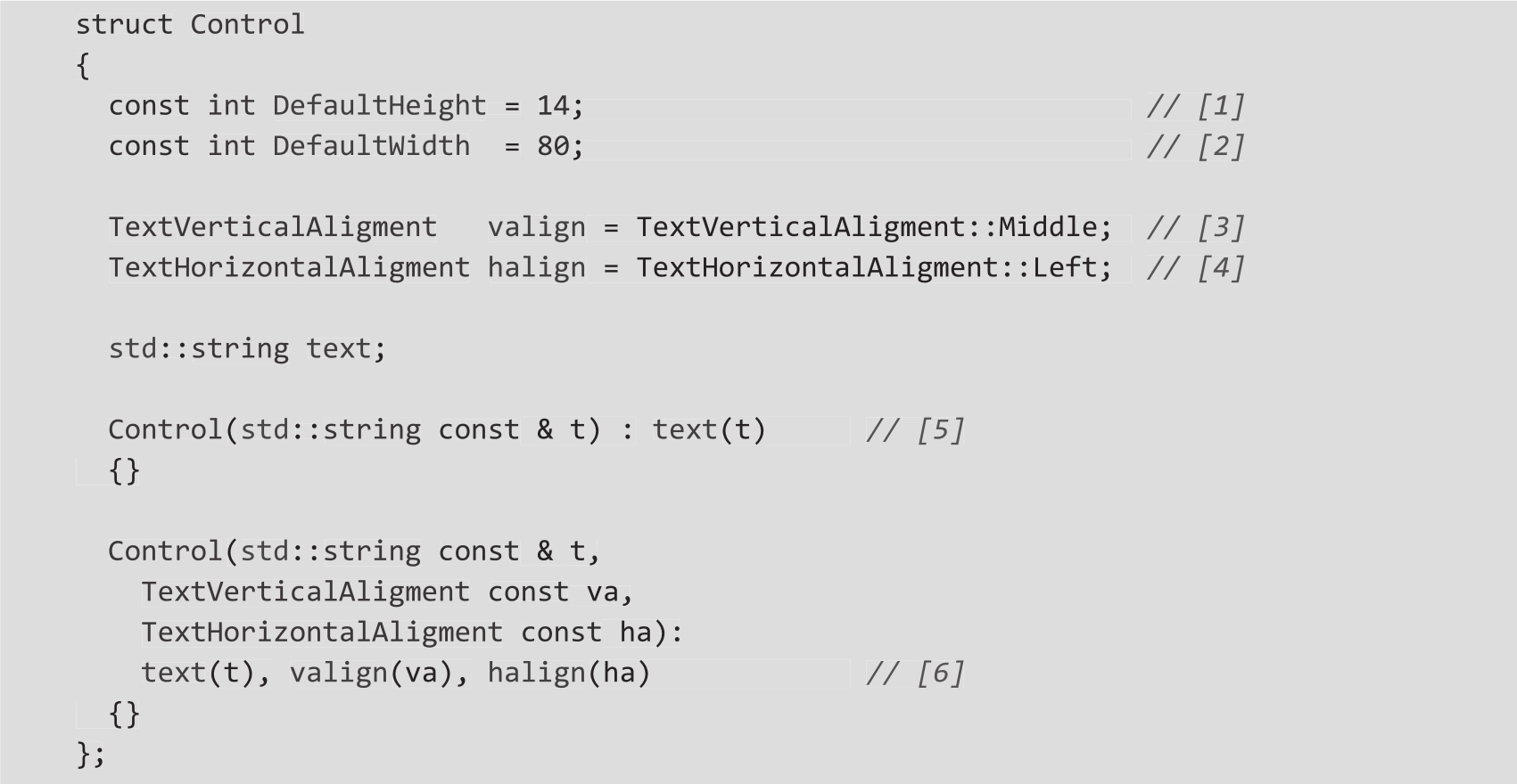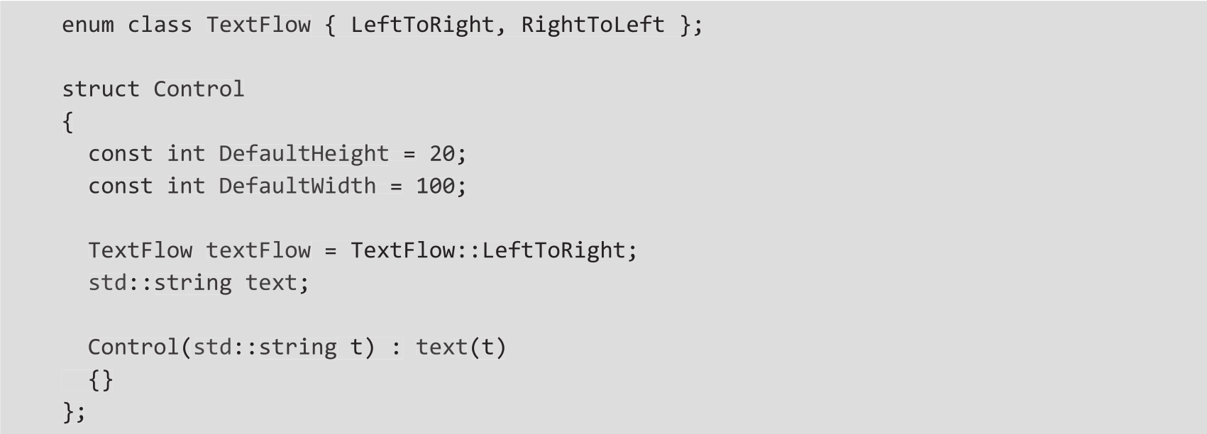 在前面的例子中,DefaultHeight和DefaultWidth都是常量,因此它们不依赖对象的构造方式,所以它们在声明时初始化。textFlow对象是非常量非静态数据成员,它的值不依赖对象的初始化(它的值可以通过另外的成员函数进行修改),因此也可以在声明的时候用默认成员初始化方法进行初始化。另外,text也是一个非常量非静态数据成员,但是它的初始值依赖对象的构造方式,因此它是通过传给构造函数的参数值以构造函数初始化列表的形式进行初始化的。