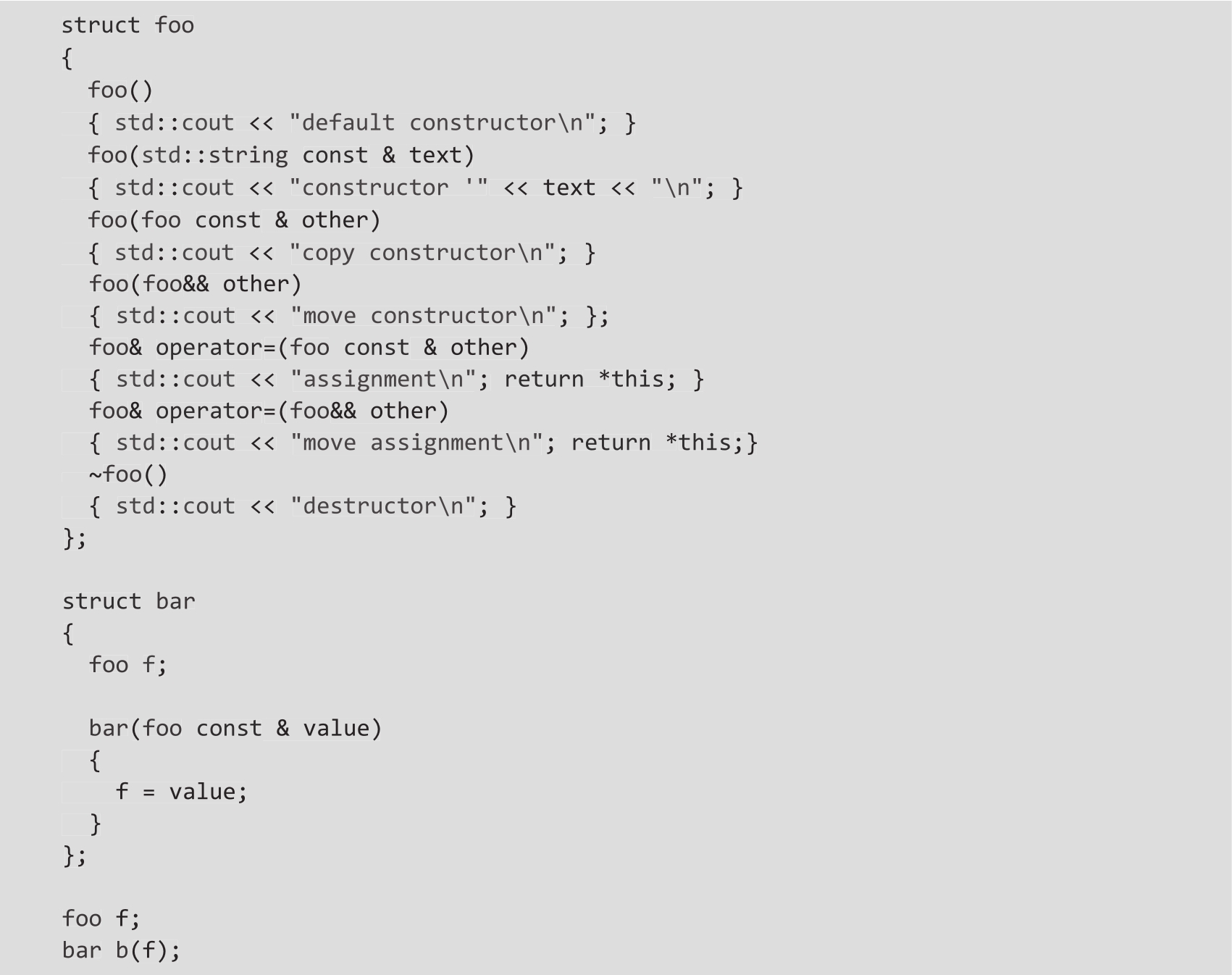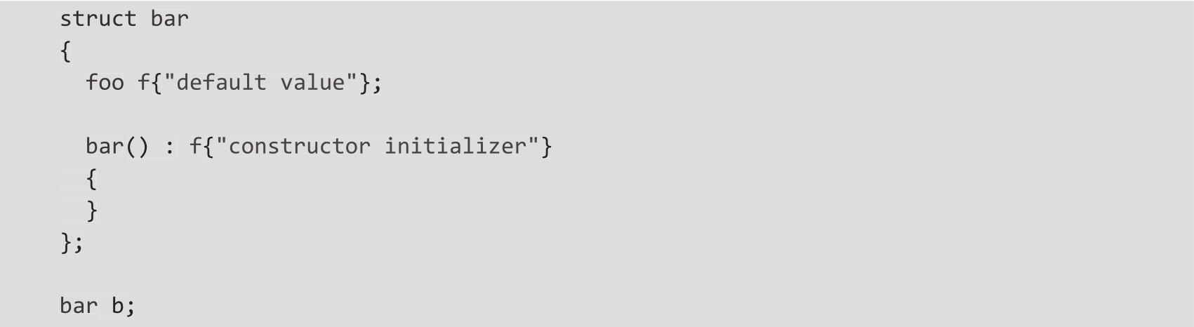 如果一个数据成员既可用默认成员初始化方法初始化,也可用构造函数初始化列表形式初始化,则后者优先,默认值会被丢弃。为了说明这一点,我们再看看之前代码中的foo类以及下面的bar类: