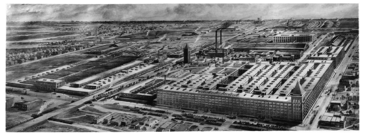 一个经典案例是霍桑效应。1924年至1932年期间,调研人员调研了一家位于伊利诺伊州的生产电气设备的工厂——霍桑工厂(见图2-4)。他们想知道工作条件对生产力的影响。工人被分为两组:相同照明条件下工作的对照组,以及更明亮的灯光下工作的实验组。当他们增加光照亮度时,工人生产力也跟着提升了。但令人惊讶的是,参与调研的所有分组的生产力都有所提升——光照强度没有增加的对照组亦是如此。