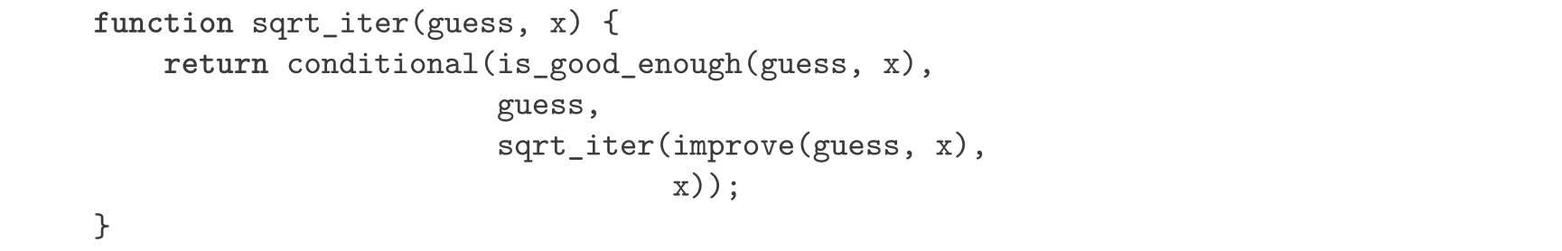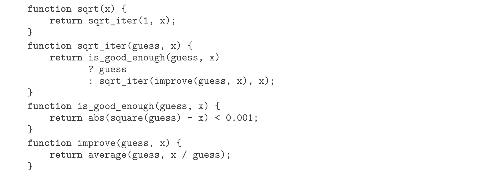 这个sqrt程序也说明,至今已经介绍的这个简单的函数式语言,已经足以写出可以用其他语言(例如C或Pascal)写出的任何纯粹数值计算的程序了。这件事看起来可能很让人吃惊,因为在我们的语言里甚至没有包括任何迭代结构(循环,它们可用于指挥计算机去一遍遍地做某些事情)。而在另一方面,sqrt_iter展示了如何不用特殊的迭代结构来实现迭代,其中只需要使用常规的函数调用能力