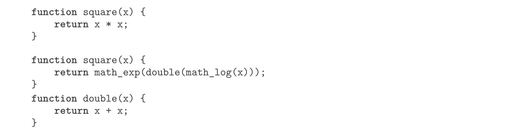 这样,如果只考虑返回值,下面这两个求数值平方的函数并无差别。两者都以一个数值作为参数,产生这个数的平方作为函数值