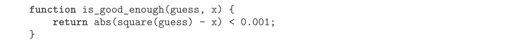我们还必须说明什么是“足够好”。下面的做法只是为了说明问题,它实际上并不是一个很好的检测方法(参看练习1.7)。这里的想法是,不断改进答案直至它足够接近平方根,使其平方与被开方数之差小于某个事先确定的误差值(这里用的是0.001)
