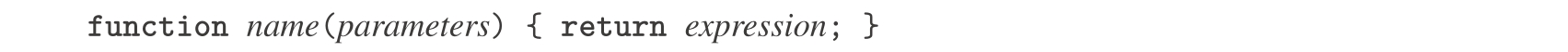 其中的 name 是一个名字,函数的定义将在环境中关联于这个名字 [1] parameters (形式参数)是一些名字,它们被用在函数体里,表示要求引用在应用这个函数时提供的各个实参。这些 parameters 写在一对括号里,用逗号分隔,就像所声明的函数被实际调用时的写法。在最简单的形式里,这里的 body 就是一个 返回语句 ,由关键字 return 和一个 返回表达式 构成 。在函数应用时,声明中的形式参数被与之对应的实参取代,返回表达式的执行生成函数应用的值。与常量声明和表达式语句一样,返回语句最后也需要有分号。