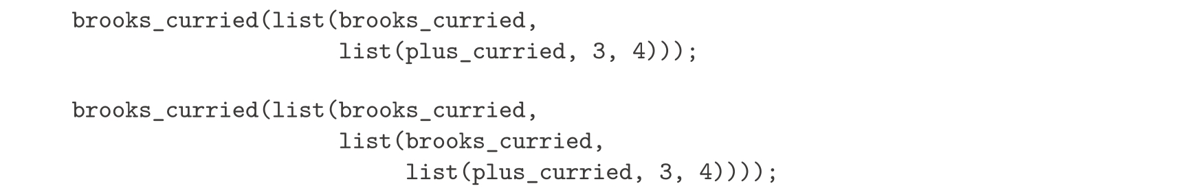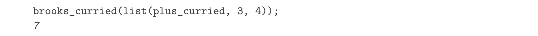 请写一个函数brooks,它的第一个参数是需要curry化的函数,第二个参数是一个实参的表,经过curry化的函数应该按给定顺序,一个个地应用于这些实际参数。例如,brooks的如下应用应该等价于plus_curried(3)(4):