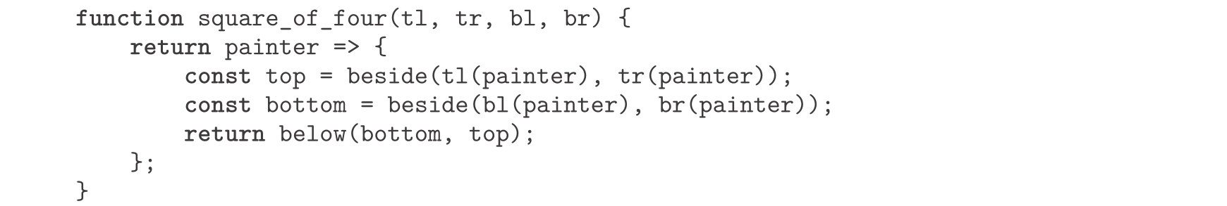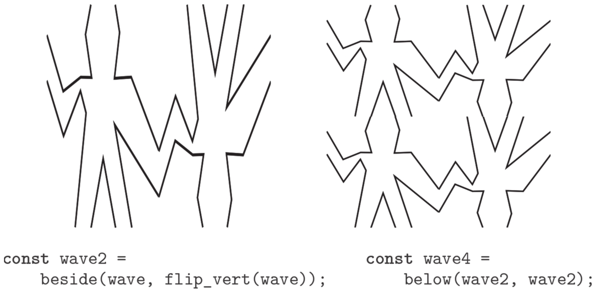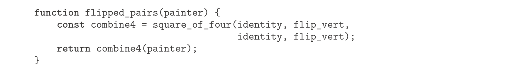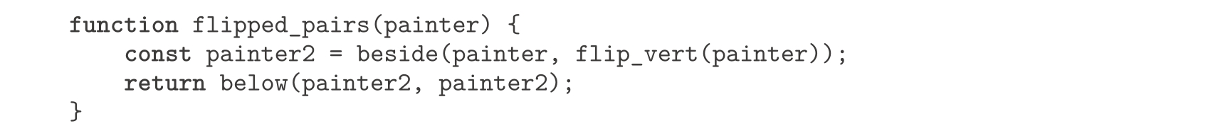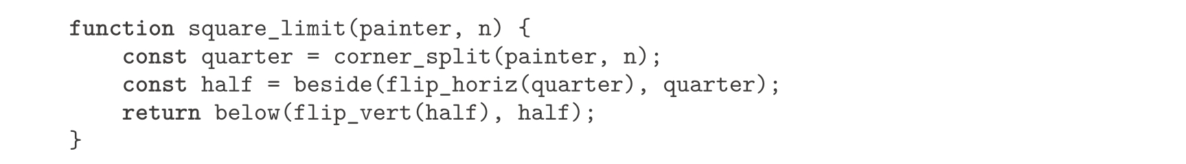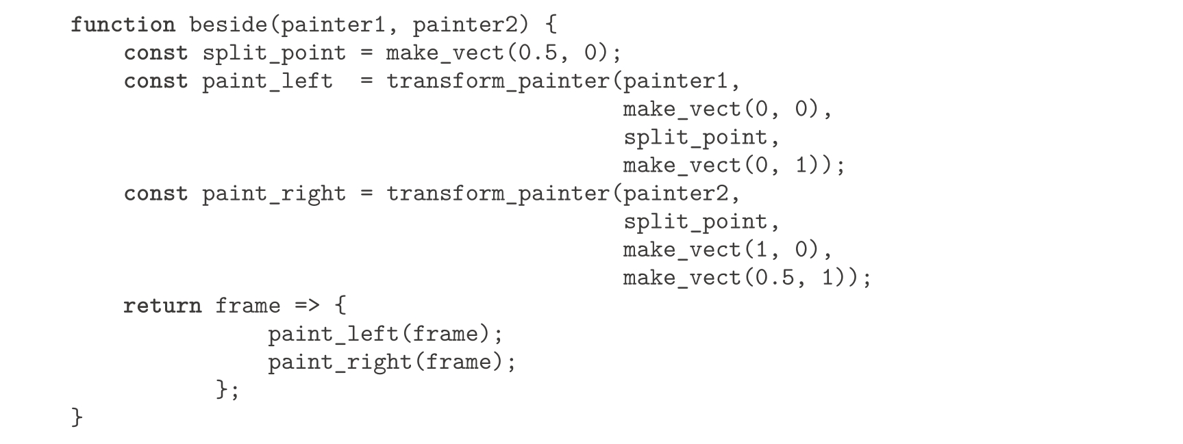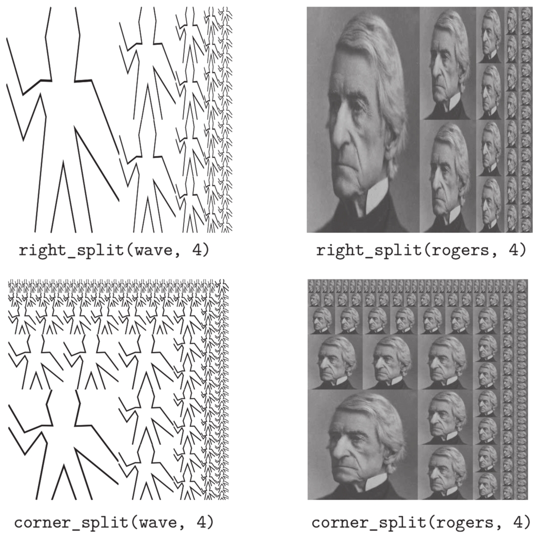 为了组合各种图像,我们用一些可以从给定的画家构造新画家的操作。例如,操作beside从两个画家出发,产生一个新的复合画家,它把第一个画家的图像画在框架的左边一半,把第二个画家的图像画在框架的右边一半。与此类似,below从两个画家出发产生一个复合画家,把第一个画家的图像画在第二个画家的图像之下。有些操作把一个画家转换为另一新画家。例如,flip_vert从一个画家出发,生成一个把原画家所画的图上下颠倒画出的画家,而flip_horiz生成的画家把原画家的图左右反转后画出。