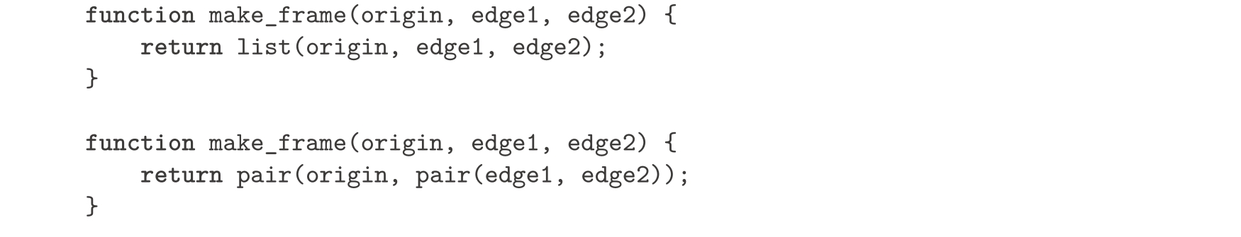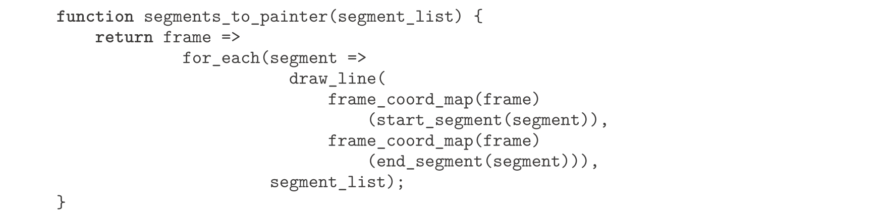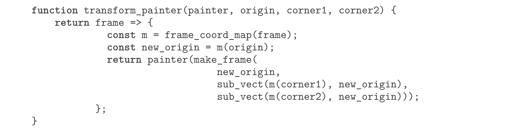 用函数表示画家,在这个图形语言里建立了一条强有力的抽象屏障,使我们可以基于各种图形能力,创建和混用各种类型的基本画家。任何函数,只要它以一个框架为参数,能画出一些可以伸缩后适配这个框架的图形,就可以用作画家