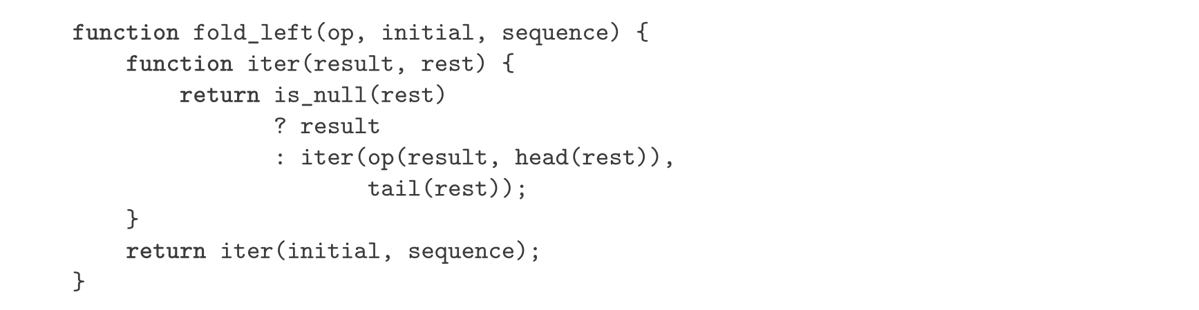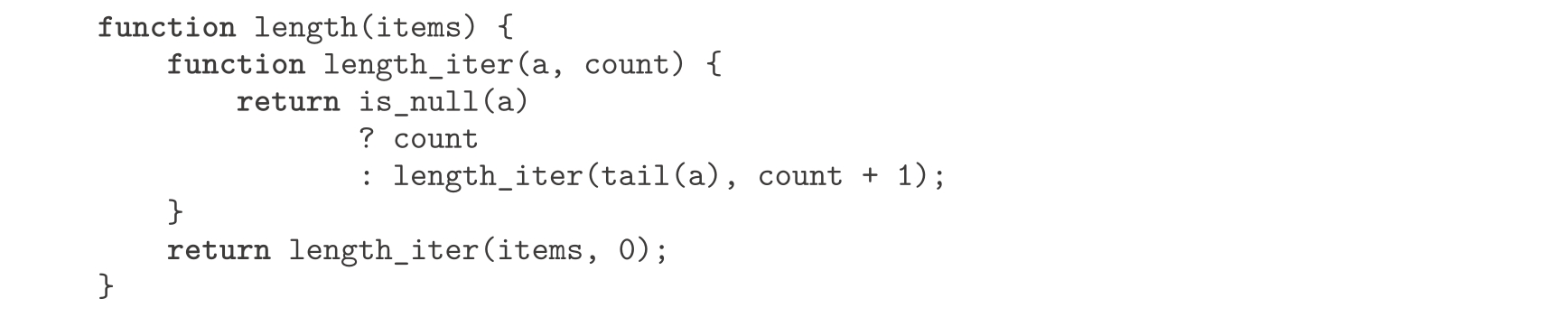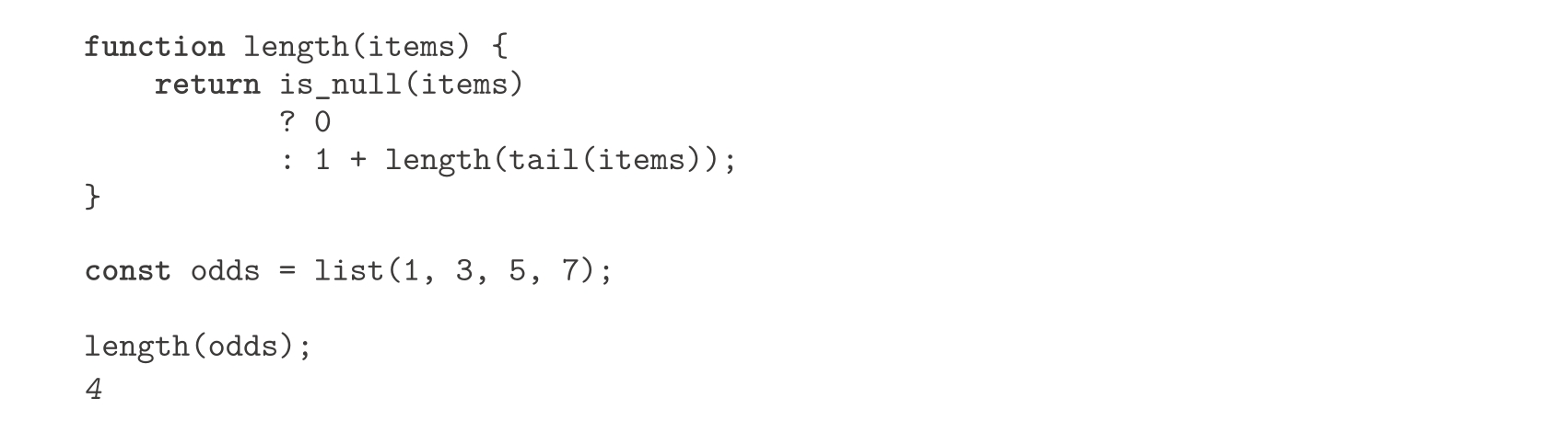 我们经常需要通过反复向下求tail的方式扫过整个表,为了支持这类操作,我们的JavaScript环境里有一个基本操作is_null,它检查自己的参数是否为空表。函数length返回表中项数,其声明很好地说明了这种典型应用模式: