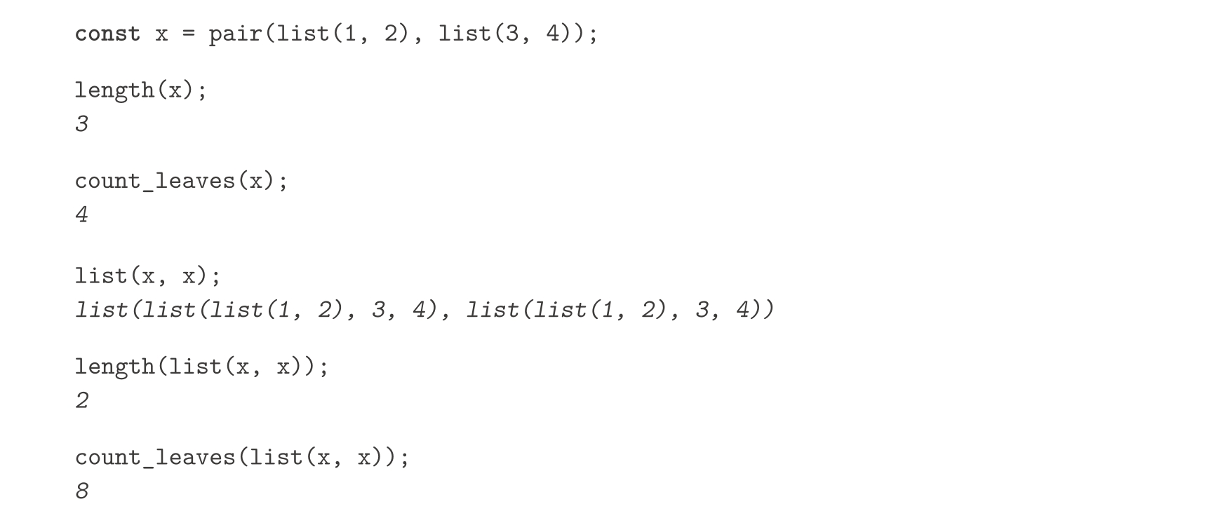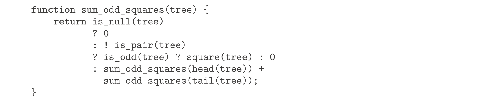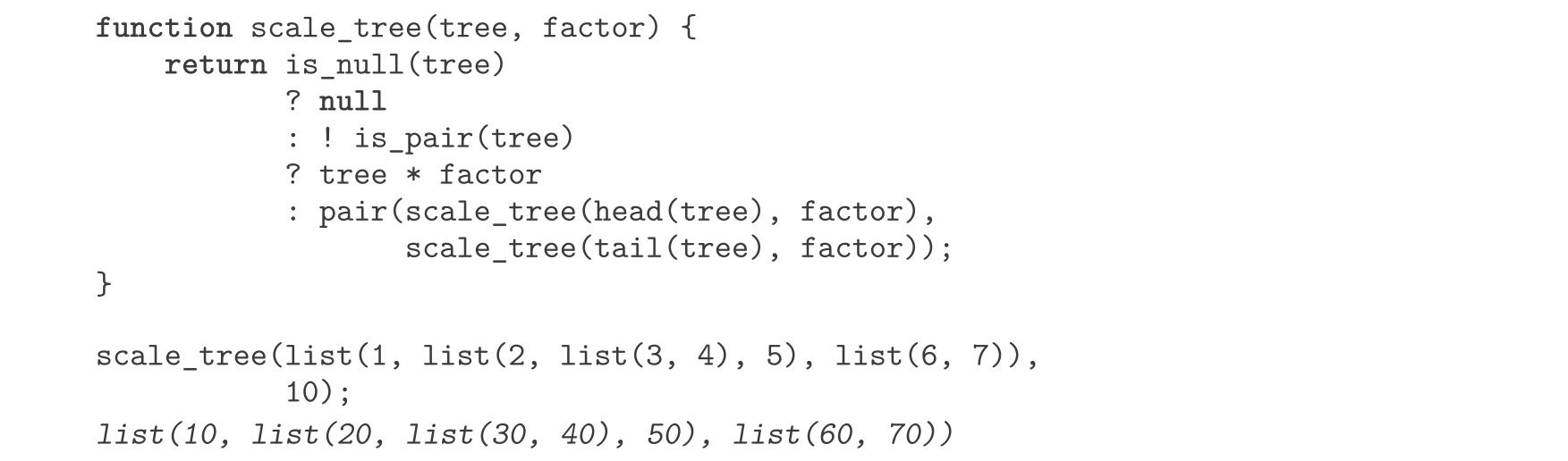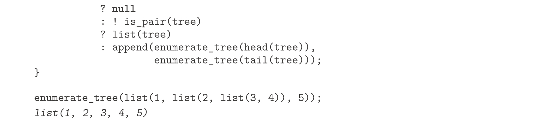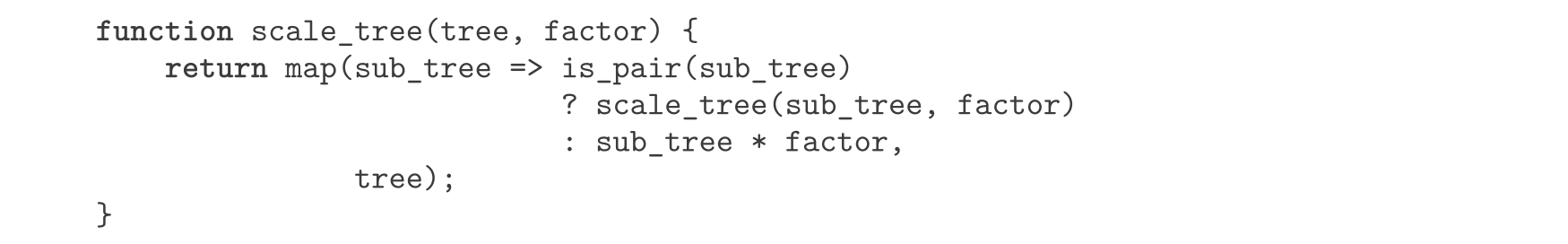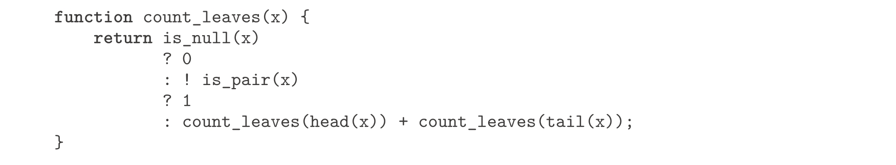 为了支持人们描述对树结构的递归处理,我们的JavaScript环境提供了一个基本谓词is_pair,它检查其参数是否为序对。下面是完整函数的声明