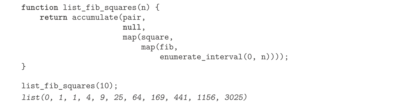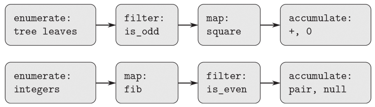 函数map是一种非常重要的结构,因为它不仅代表了一种公共模式,而且建立了一种处理表的高层抽象。在scale_list原来的声明里,程序的递归结构把人的注意力吸引到对表中元素的逐个处理过程。基于map声明的scale_list则抑制了这种细节层面的事务,强调从元素表到结果表的一个缩放变换。这两种定义形式之间的差异,并不在于计算机会执行不同的计算过程(其实不会),而在于我们对这个过程的不同思考方式。从作用上看,map帮助我们建立起一层抽象屏障,把实现表变换的函数,与如何提取和组合表中元素的细节隔离开。与图2.1展示的屏障类似,这种抽象也提供了新的灵活性,它使我们有可能在保持从序列到序列的变换操作框架的同时,改变序列实现的低层细节。2.2.3节将把序列的这种使用方式扩展为一种组织程序的框架。