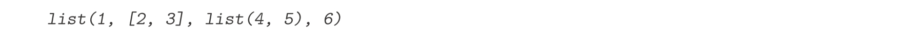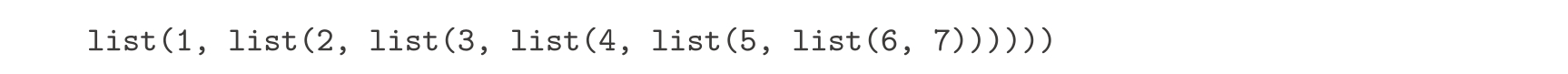 盒子记法有时比较难看明白。在本书中,如果我们想说明一个数据结构具有表的特征,将会使用另一种 表记法 。只要可行,在表示数据结构时,我们将用函数list的应用来表示其求值能得到的结果。例如,对于用盒子记法描述的结构: