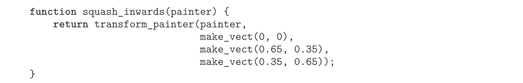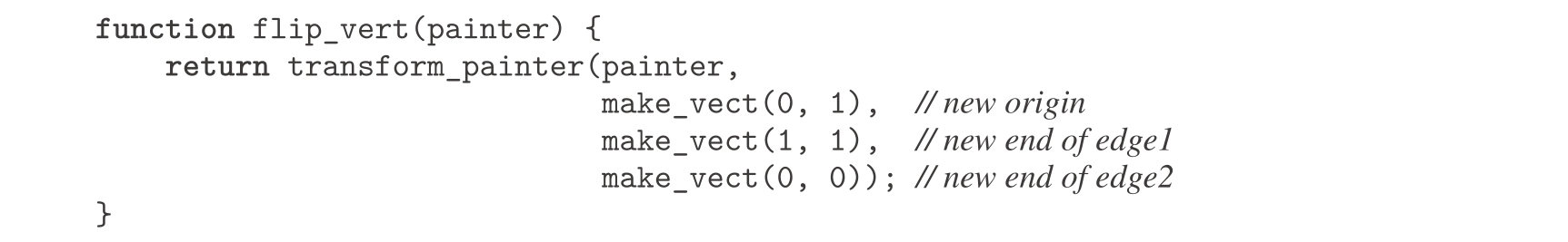 对画家的操作(例如flip_vert或beside)就是创建新画家。这个新画家将针对根据参数框架做出的新框架去调用原来的参数画家。举个例子,flip_vert在反转一个画家时完全不知道它如何工作,只要知道如何倒置一个框架就足够了。这个操作产生的画家就是使用原来的画家,但要求它在倒置的框架里工作。