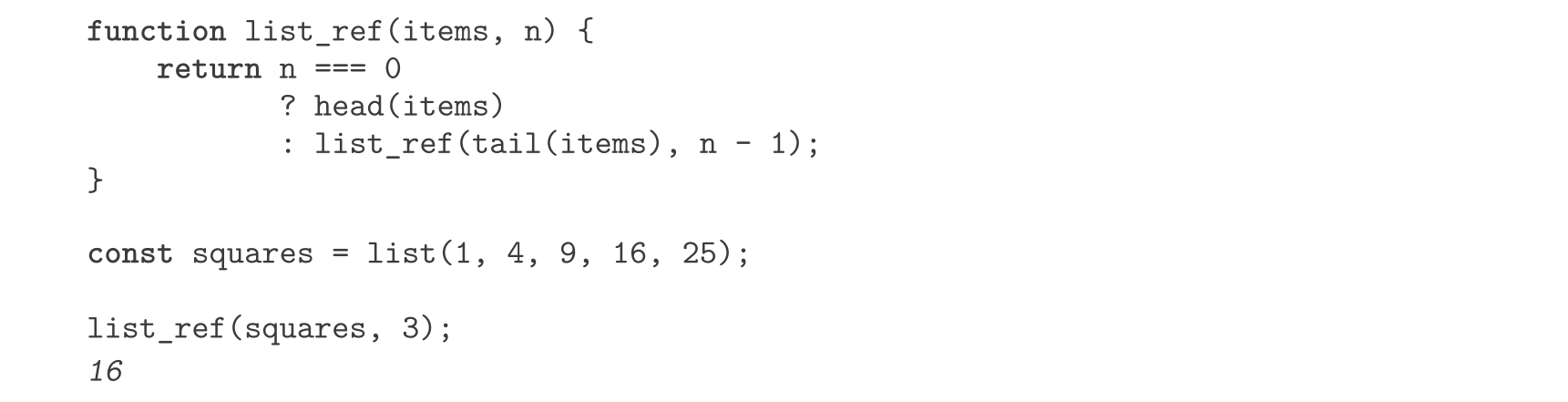 用序对将元素的序列表示为表后,随之而来的一种常用程序设计技术,就是通过对表反复向下求tail的方式完成对表的操作。例如,函数list_ref以一个表和一个数 n 为实参,返回表里的第 n 个项(人们习惯令表元素编号从0开始)。计算list_ref的方法如下: