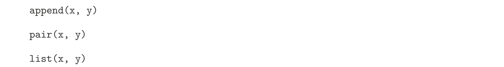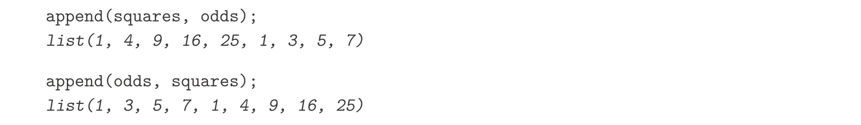 另一种常用的程序设计技术,是在对一个表向下求tail的过程中,通过不断用pair在前面加入元素的方式构造一个作为结果的表。函数append就是这样做的,这个函数以两个表为参数,组合起它们的元素,做成一个新表: