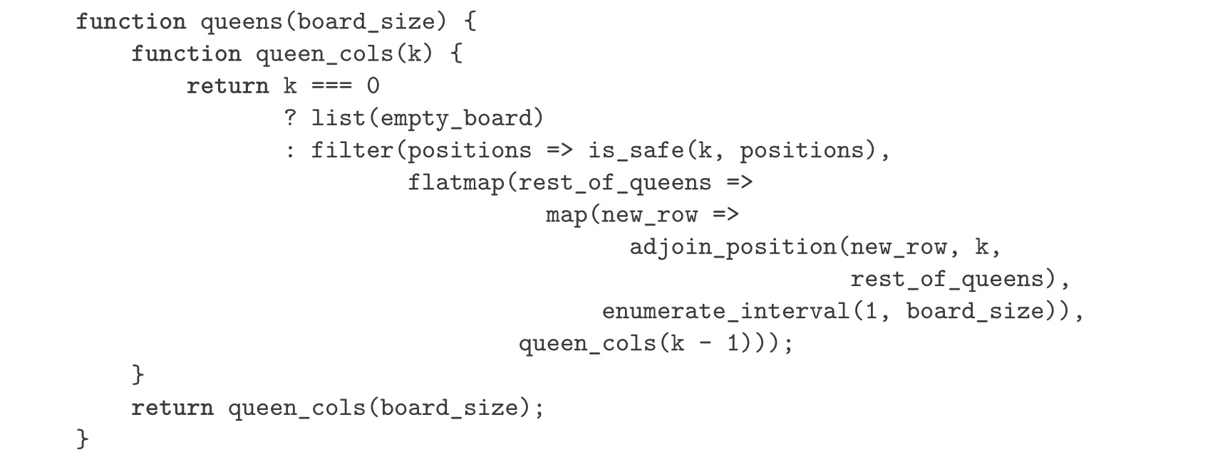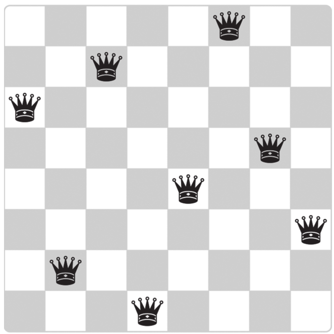练习2.42 “八皇后谜题”问怎样把八个皇后摆在国际象棋盘上,使得没有一个皇后能攻击另一个(也就是说,任意两个皇后都不在同一行、同一列,或者同一斜线上)。该谜题的一个解如图2.8所示。解决这个谜题的一种方法是按一个方向考虑棋盘,每次在一列中放入一个皇后。如果现在已经放好了 k -1个皇后,第 k 个皇后就必须放在不会攻击任何已在棋盘上的皇后的位置。我们可以递归地描述这一处理过程:假定我们已经生成了在棋盘前 k -1列放 k -1个皇后的所有可能方法,现在对其中的每种方法,生成把下一皇后放在第 k 列中每一行的扩充集合。然后过滤它们,只留下使第 k 列的皇后与其他皇后相安无事的扩充。这样就生成了 k 个皇后放在前 k 列的所有安全序列。继续这一过程就能得到该谜题的所有解,而不是一个解。