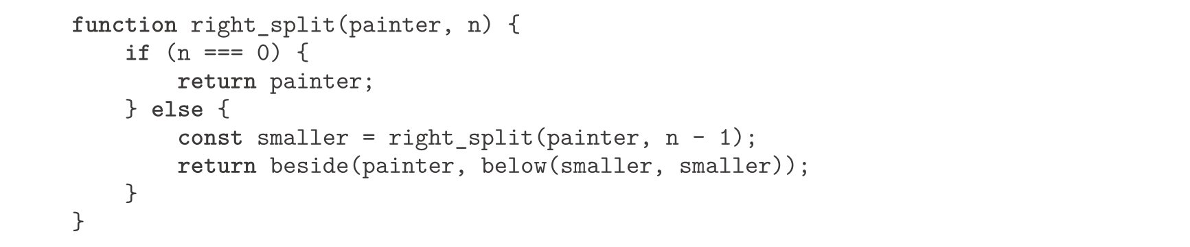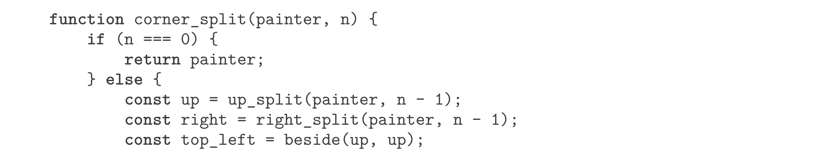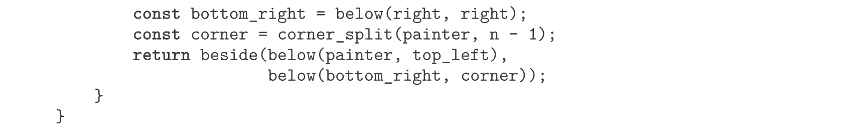 在通过这种方法构造复杂的图像时,我们利用了一个事实,在这个语言的组合操作下画家是封闭的:两个画家的beside或below得到的还是画家,因此可以被用作元素去构造更复杂的画家。就像用pair可以构造各种表结构一样,数据在组合方法下的闭包性质非常重要,因为这使我们能用不多的几个操作构造出各种复杂的结构。