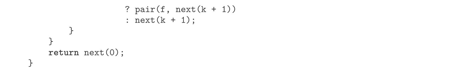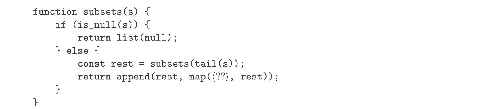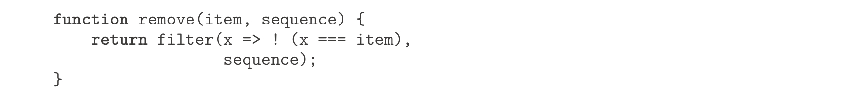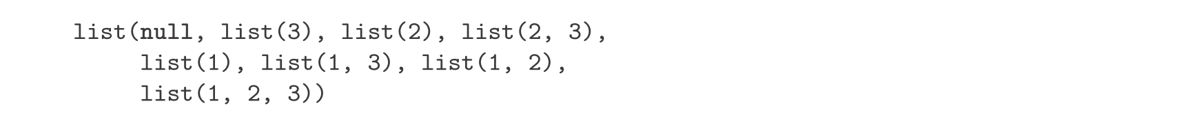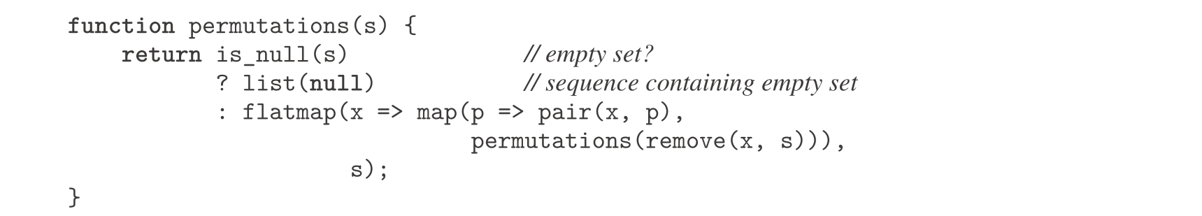 请注意这里的策略:我们把生成 S 的所有排列的问题,归结为生成元素少于 S 的集合的排列的问题。终极情况是遇到空表,它表示无元素的集合,此时生成的就是list(null),这是一个只包含一个元素的序列,该元素是一个无元素的集合。在permutations函数里使用的remove函数返回除去指定项之外的所有元素,它可以简单地用一个过滤器描述: