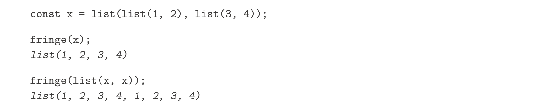 练习2.28 请写一个函数fringe,它以一个树(表示为一个表)为参数,返回一个表,该表里的元素就是这棵树的所有树叶,按从左到右的顺序排列。例如: