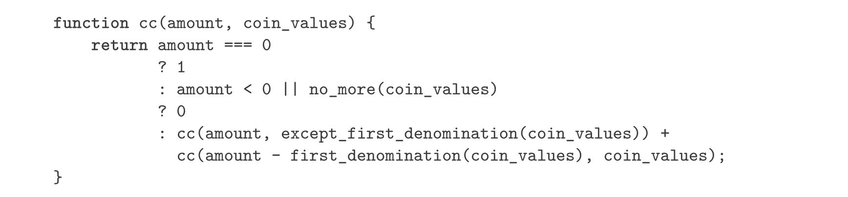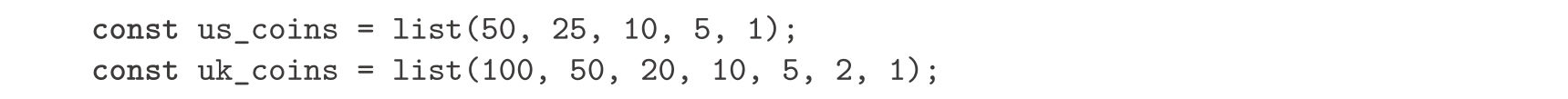 我们希望重写函数cc,令其第二个参数是一个可用硬币的币值表,而不是一个表示可用硬币种类的整数。然后我们就可以针对每种货币定义一个表: