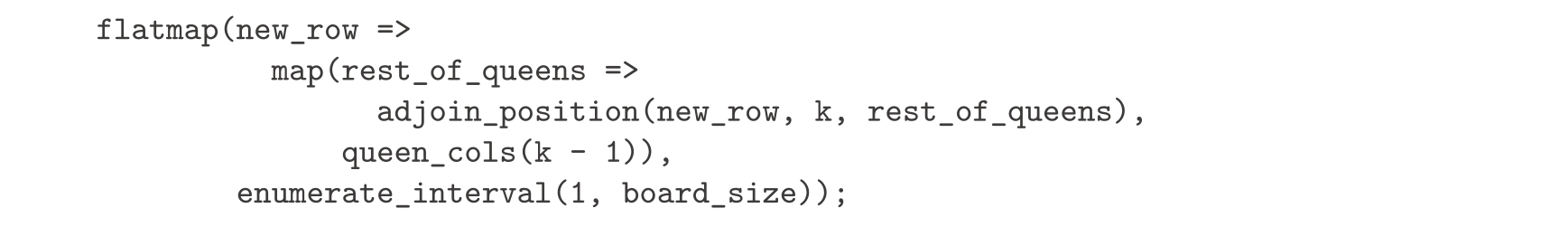 我们把这个解法实现为一个函数queens,令它返回在 n × n 的棋盘上放好 n 个皇后的所有解的序列。函数queens有一个内部函数queen_cols,它返回在棋盘的前 k 列中放好皇后的所有位置的序列。