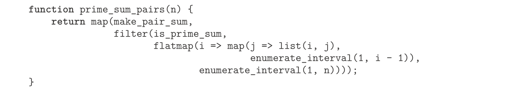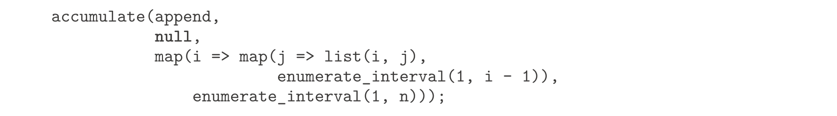 练习2.40 请写一个函数unique_pairs,给它一个整数参数 n ,它产生所有序对( i , j )的序列,其中1≤ j < i ≤ n 。请用unique_pairs简化上面prime_sum_pairs的定义。