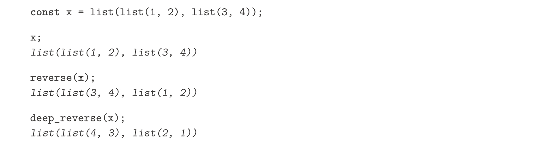 练习2.27 请修改你在练习2.18做的reverse函数,做一个deep_reverse函数。它以一个表为参数,返回另一个表作为值。结果表中的元素反转,所有的子树也反转。例如: