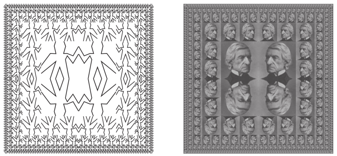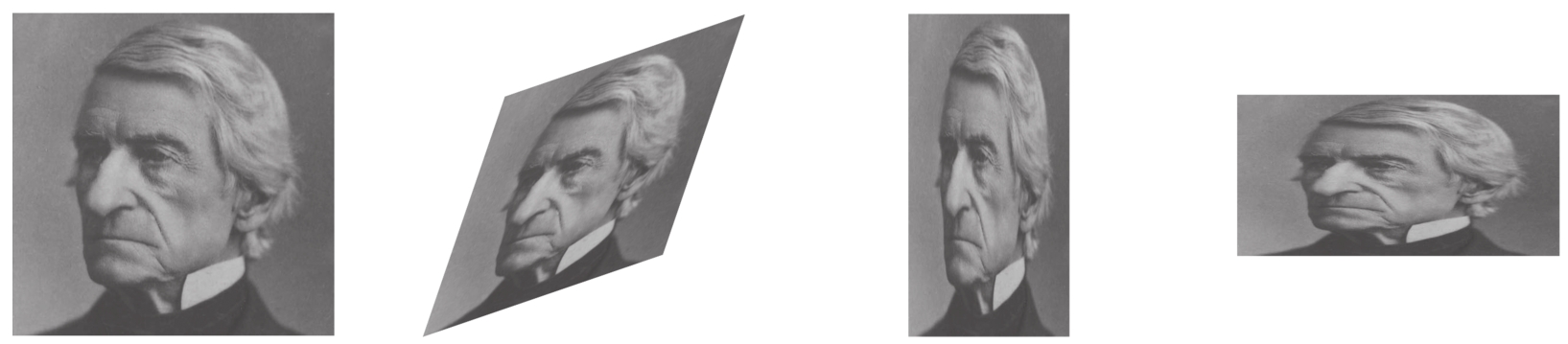 我们准备研究的这个图形语言的优美之处,部分在于这个语言里只有一类元素,称为 画家 (painter)。一个画家能画出一张图,这种图可以变形或者改变大小,以便正好放到指定的平行四边形框架里。举例说,有一个称为wave的基本画家,它能画出图2.10所示的折线图,而图的实际形状依赖于具体的框架;图2.10里的四个图都是由同一画家wave生成的,但这些图是相对于四个不同的框架。画家也可以更精妙。基本画家rogers能画出MIT的创始人William Barton Rogers的画像,如图2.11所示 [6] 。图2.11里的四个图是相对于与图2.10中wave形象同样的四个框架画出的。