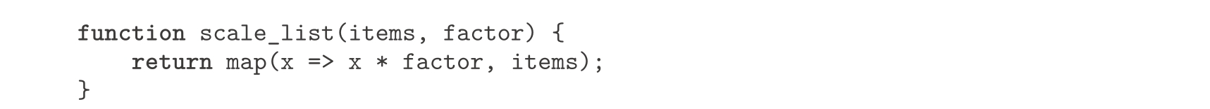 有一个操作特别有用,那就是把某个变换应用于一个表里的所有元素,得到由所有结果构成的表。举例说,下面的函数按给定的因子,对一个表里的所有元素做缩放: