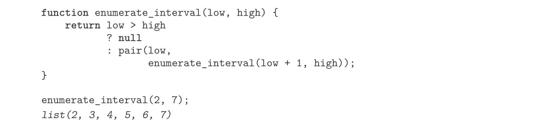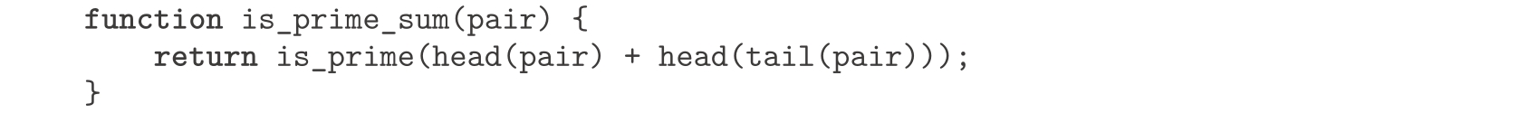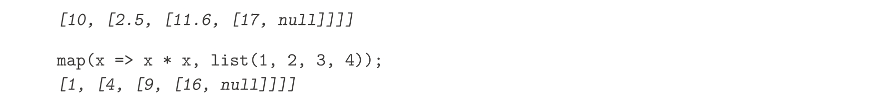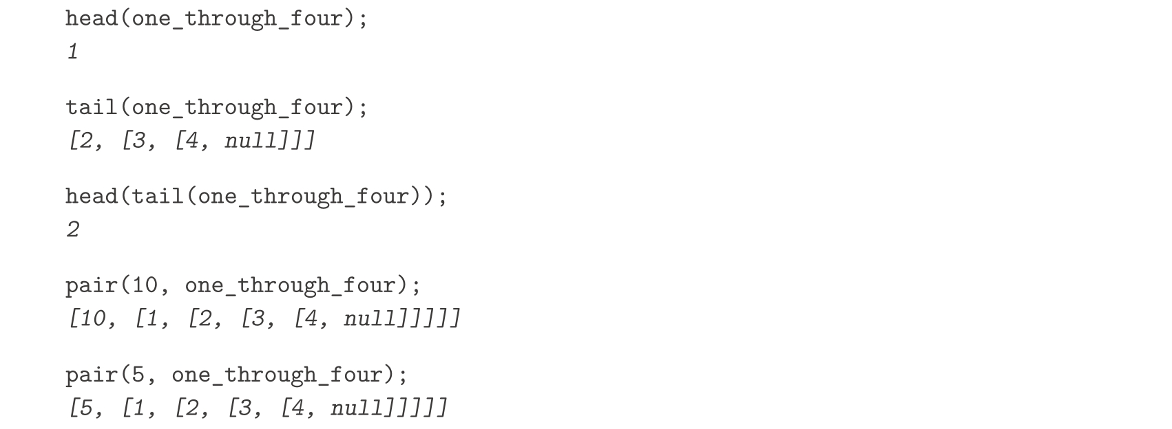 我们可以认为head选取表中的第一项,tail选取表中除去第一项之后剩下的所有项形成的子表。嵌套地应用head和tail,就能取出表里的第二、第三以及后面的各项。构造函数pair用于构造与原表类似的表,但前面增加了一项: