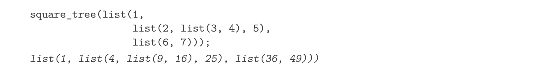 实现scale_tree的另一种方法是把树看成子树的序列,对它使用map。我们对这种序列做映射,顺序地对各棵子树逐个缩放,并返回结果的表。对于基础情况,也就是当被处理的树是树叶时,就直接用因子去乘它: