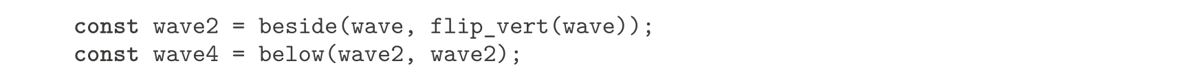 在我们能组合画家之后,就会希望能抽象出组合画家的典型模式,把对画家的操作实现为JavaScript函数。这也意味着我们在图形语言里不需要任何特殊的抽象机制。因为组合的方法就是常规的JavaScript函数,这样,我们就自动地能对画家做原来可以对函数做的所有事情。例如,我们可以把wave4中的模式抽象出来: