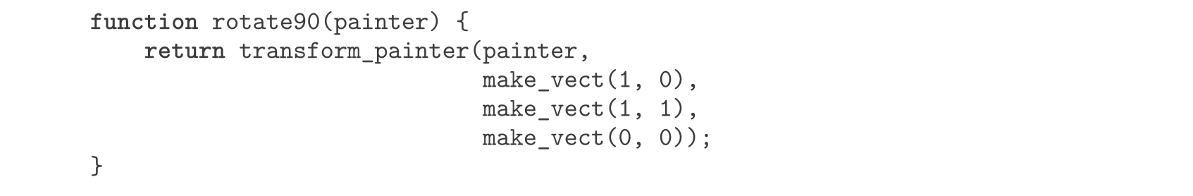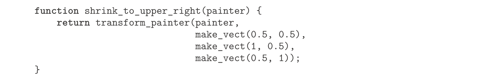 对画家的操作都基于函数transform_painter,该函数以一个画家和有关如何变换框架和生成新画家的信息作为参数。用一个框架调用变换后的画家时,我们将变换这个框架,然后用变换后的框架去调用原来那个画家。transform_painter的参数是描述新框架各个角的几个点(用向量表示)。在做针对框架的映射时,第一个点描述新框架的原点,另外两个点描述新框架的两个边向量的终点。这样,位于单位正方形里的参数,描述的就是一个包含在原框架里的框架。