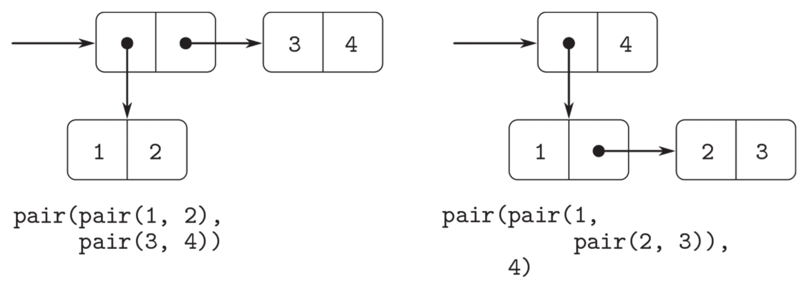 我们已经看到,pair不仅可以用于组合数值,也可以用于组合序对(你在做练习2.2和练习2.3时已经——或者说应该——熟悉这一事实)。作为这种情况的推论,序对是一种通用的砌块,我们可以利用它构造所有种类的数据结构。图2.3显示的是组合数值1、2、3、4的两种不同方法。