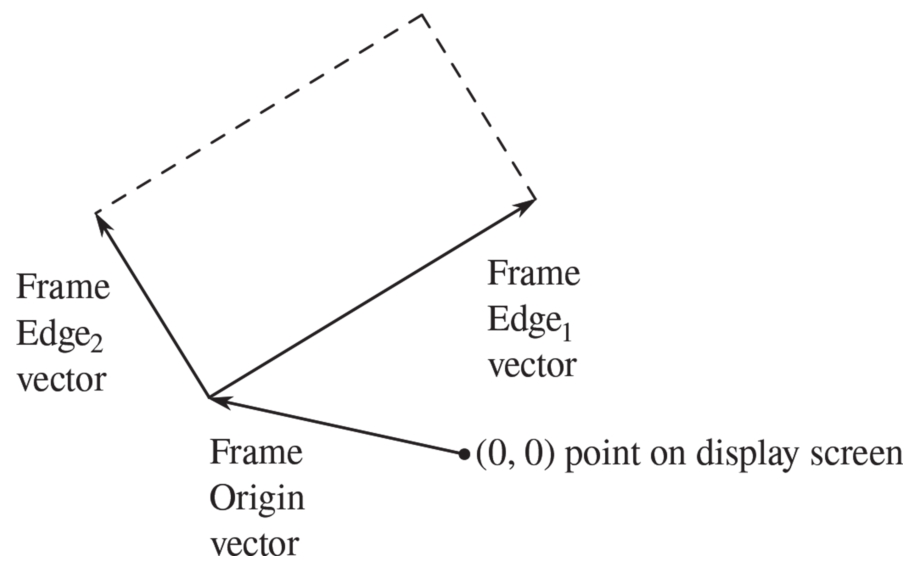 在说明如何实现画家及其组合方法之前,我们需要先考虑框架的问题。一个框架可以用三个向量描述:一个基准向量和两个角向量。基准向量描述框架基准点相对于平面上某个绝对基准点的偏移量,角向量描述框架的角点相对于框架基准点的偏移量。如果两个角向量正交,这个框架就是矩形,否则它就是一般的平行四边形。