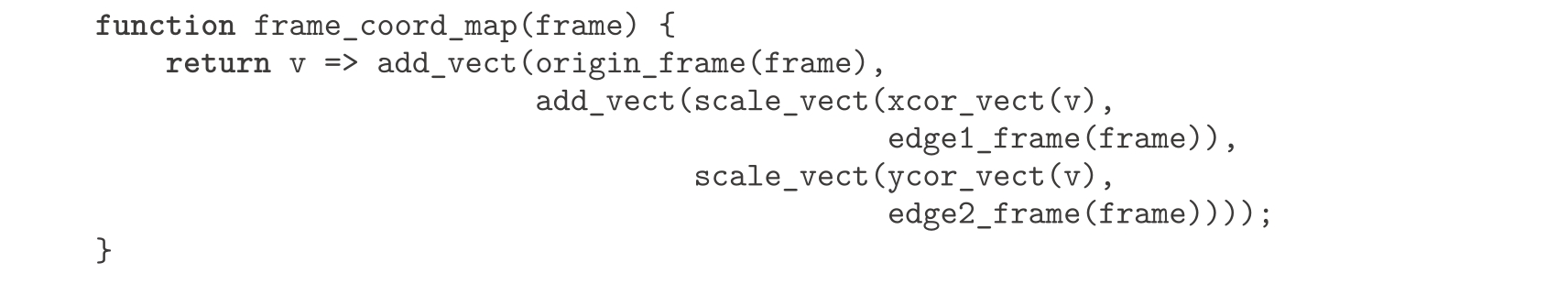 注意,把frame_coord_map应用于一个框架将返回一个函数,送给这个函数一个向量,它返回另一个向量。如果参数向量位于单位正方形里,结果向量就位于相应框架里。例如: