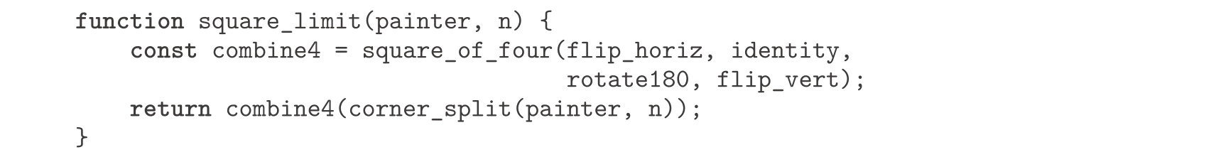 举例说,flipped_pairs和square_limit都是把一个画家的四个拷贝安排在一个正方形的模式中,它们之间的不同只在这些拷贝的旋转角度。抽象这种画家组合模式的一种方法是定义如下函数,它基于四个单参数的画家操作,生成一个新的画家操作,在这个操作里用四个参数操作变换给定的画家,然后把得到的结果放入一个正方形里 [7] 。tl、tr、bl和br分别是应用于左上角、右上角、左下角和右下角的四个拷贝的变换: