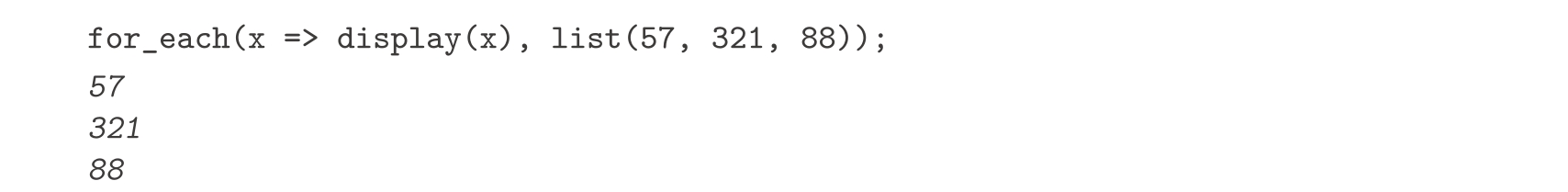 练习2.23 函数for_each与map类似,它也以一个函数和一个元素表为参数,但是它并不返回结果的表,只是把这个函数从左到右逐个应用于表中元素,并且把函数应用返回的值都丢掉。for_each通常用于那些执行某些动作的函数,如打印等。请看下面的例子: