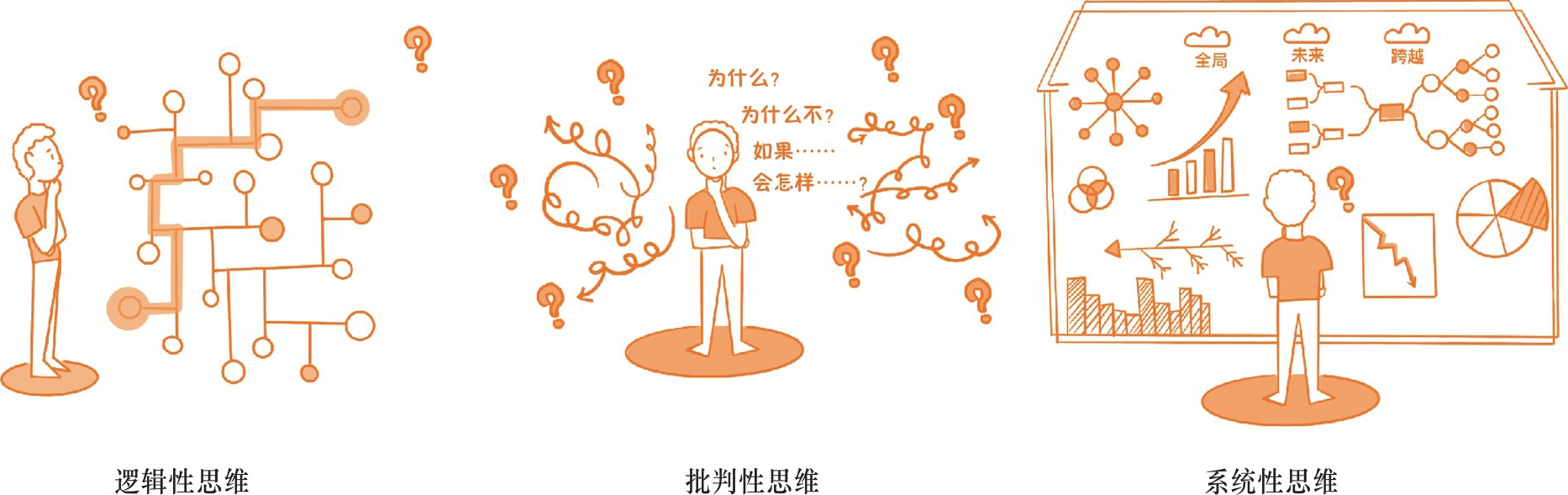 如何训练我们的关键性思维呢?有三种方法,它们分别是“逻辑性思维”“批判性思维”和“系统性思维”。这三种方法的难度逐渐递增,对个人思维能力的要求逐步加深。我们尝试用图像(图1-1)来展示每种思维模式的特征。