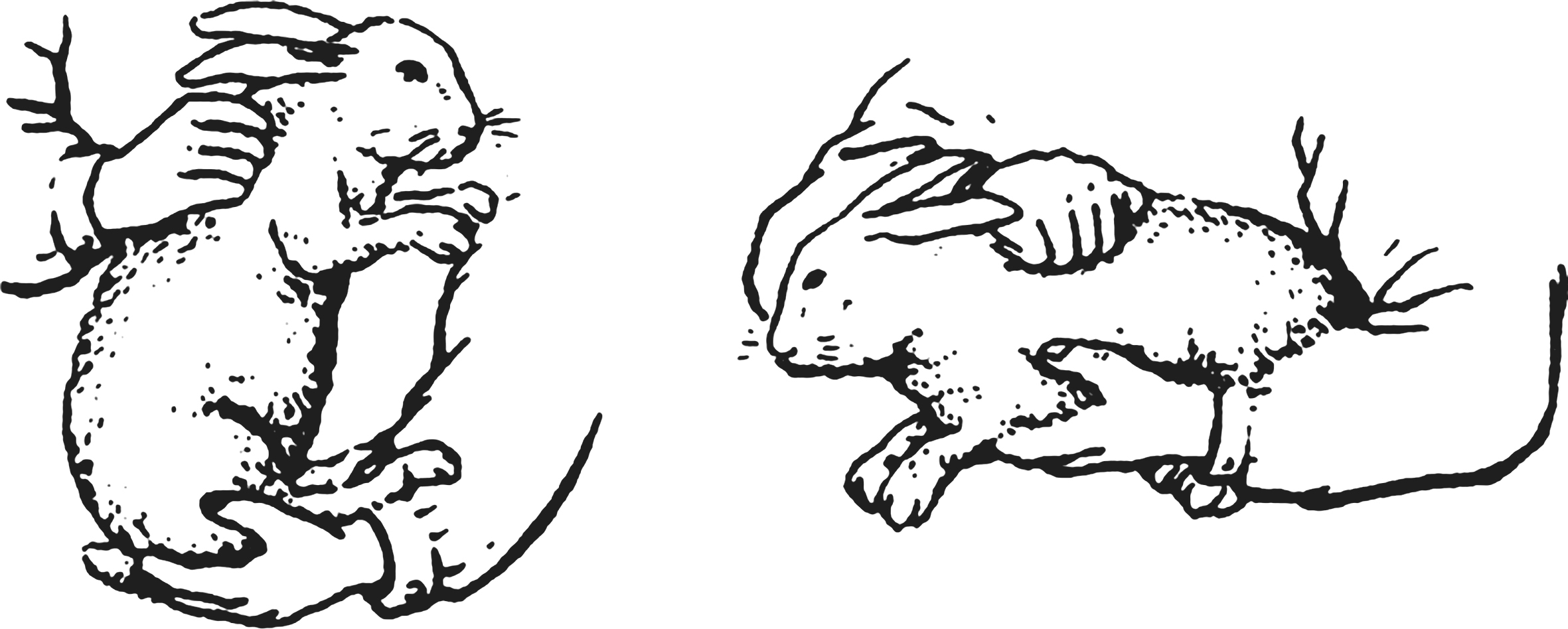 捕捉时以右手抓住家兔颈背部皮肤(不能抓两耳),轻轻把动物提起,迅速以左手托住其臀部,使动物体重主要落在抓取者的左掌心上,以免损伤动物颈部(图1-2-1-5)。家兔一般不咬人,但脚爪锐利,在挣扎反抗时容易抓伤捕捉者,所以捕捉时要特别注意其四肢。