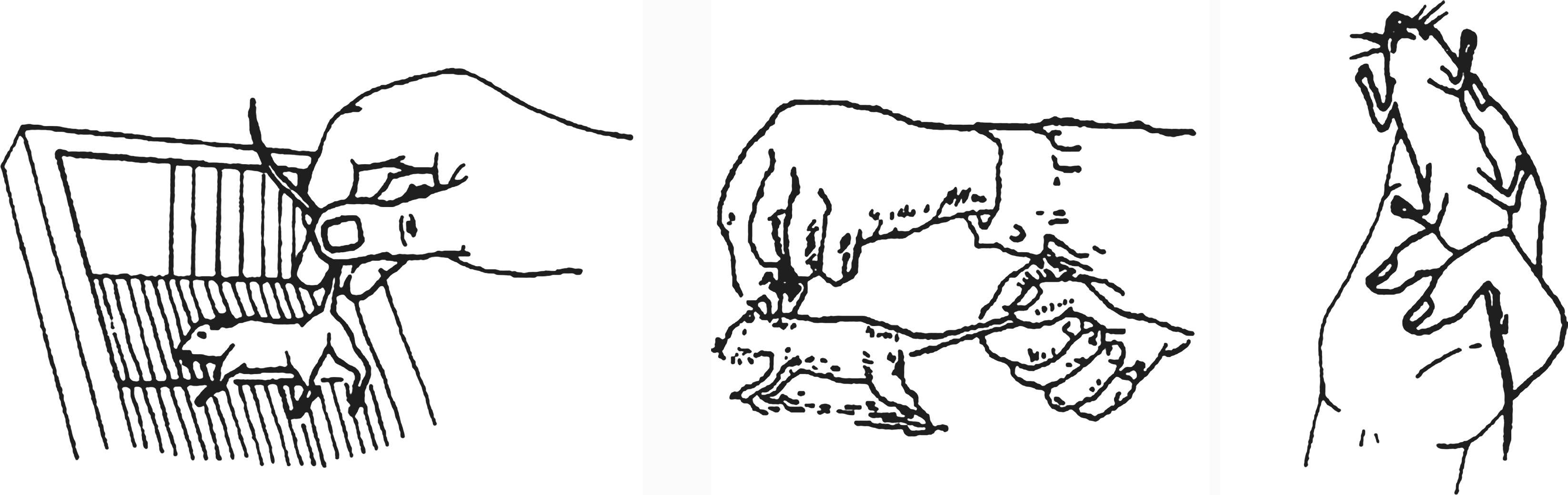图1-2-1-4 大鼠、豚鼠捉拿法和固定法