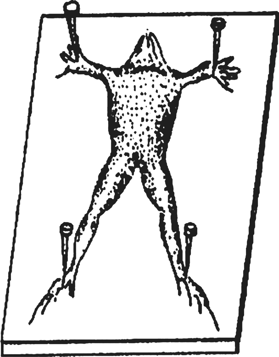 对蟾蜍进行手术或其他复杂操作时,则按实验需要的体位,用蛙钉或大头针将四肢钉于蛙板上(图1-2-1-2)。