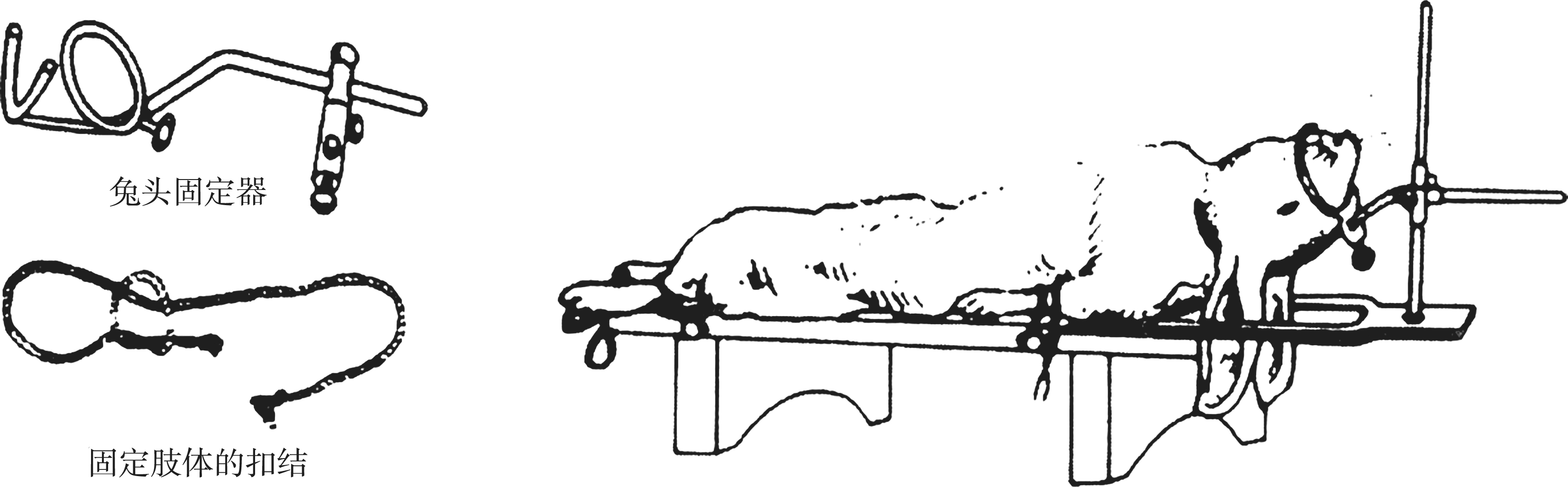 对家兔施行手术,须将家兔固定于手术台上。多数实验采用仰卧位固定,缚绳打套结绑缚四肢在踝关节上(打活结便于解开),然后将两后肢拉直,把缚绳的另一头缠绕于家兔手术台后缘的钩子上打结固定,再将绑前肢的绳子在家兔的背部穿过,并压住其对侧前肢,交叉到兔手术台对侧的钩上打结固定。最后固定头部,兔头夹固定时先将兔颈部放在半圆形的铁圈上,再把铁圈推向嘴部压紧后拧紧固定螺丝,将兔头夹的铁柄固定在兔手术台的固定柱上。棉绳固定头部时,用一根粗棉绳钩住兔两颗上门齿,将棉绳拉直后在手术台的固定柱上绕两圈后打结固定。做颈部手术时,可将一粗注射器筒垫于动物的项下,以抬高颈部,便于操作。以上方法较适于仰卧位固定。动物取俯卧位时(特别头颅部实验),常用马蹄形头固定器固定(图1-2-1-6)。