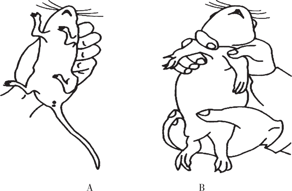 捕捉时可持其尾部末端。做腹腔注射或灌胃时,可按下法操作:实验者以右手拇指及食指抓住其尾巴,让其在粗糙台面或鼠笼上爬行,然后轻轻向后拉鼠尾,这样小鼠会四肢紧紧抓住笼面,起到暂时固定的作用。迅速以左手拇指、食指沿其背向前抓住颈部皮肤,拉直鼠身,以左手中指抵住其背部,翻转左手,使小鼠腹部向上。然后以左手无名指及小指固定其躯干下部及尾部,右手可进行实验操作(图1-2-1-3)。