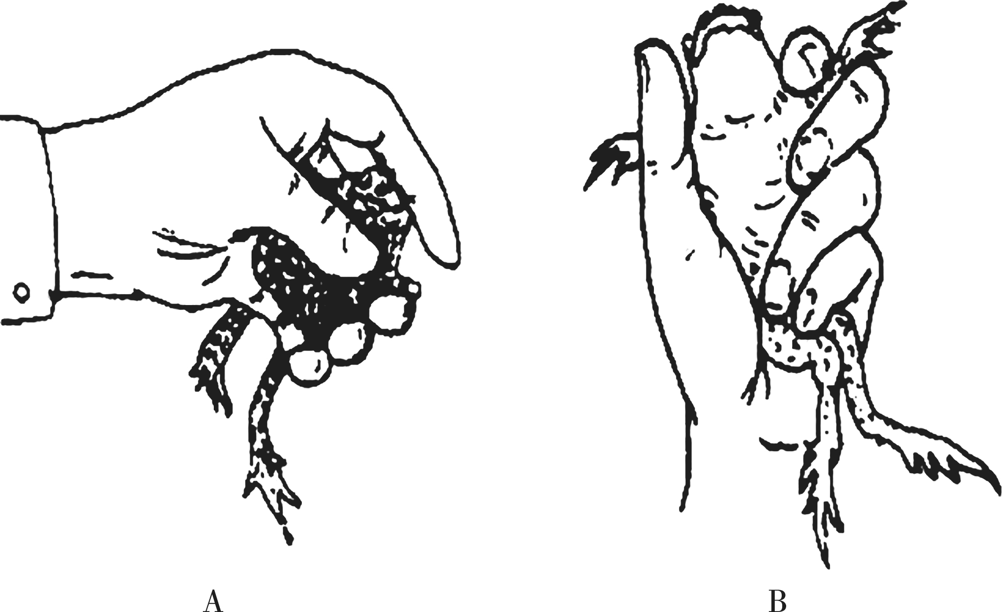 捕捉时可持其后肢。操作者以左手食指和中指夹住动物前肢,用左手拇指压住动物脊柱,右手将其双下肢拉直,用左手无名指和小指夹住(图1-2-1-1A),此法用于毁坏蟾蜍脑脊髓。做注射操作时,将蟾蜍背部紧贴手心,实验者用左手拇指及食指夹住蟾蜍头及躯干交界处,左手其他三指则握住其躯干及下肢(图1-2-1-1B)。