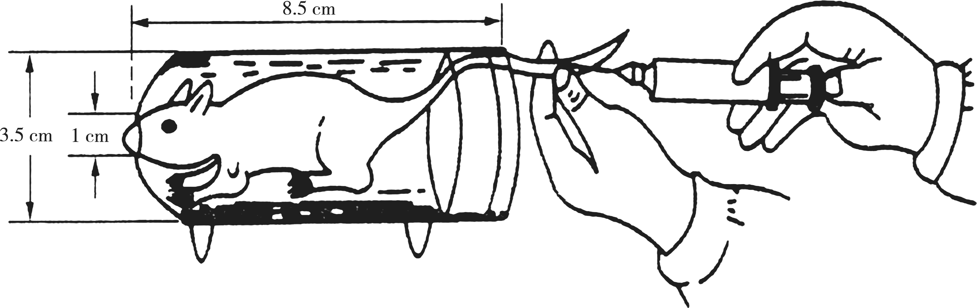 (1)小鼠、大鼠 多采用尾静脉注射。鼠尾静脉有3根,左、右两侧及背侧各1根,两侧尾静脉较易固定,应优先选择。注射时,先将动物固定于固定器内(图1-2-2-4),可采用筒底有小口的玻璃筒、金属或铁丝网笼。将全部尾巴露在外面,以右手食指轻轻弹尾尖部,必要时可用45~50°C的温水浸泡尾部或用75%乙醇反复擦拭尾部,以达到消毒、扩张血管、软化表皮角质的目的。以拇指与食指捏住尾部两侧,使尾静脉充盈明显,以无名指和小指夹持尾尖部,中指从下托起尾巴固定之。用4号针头,针头与尾部成30°刺入静脉,推动药液无阻力,且可见沿静脉血管出现一条白线,说明针头在血管内,可注药。如遇到阻力较大,皮下发白且有隆起时,说明针头不在静脉内,须拔出针头重新穿刺。注射完毕后,拨出针头,轻按注射部位止血。一般宜从尾尖端开始,逐渐向尾根部移动,以备反复应用,一次注射量为0.05~0.1mL/10g。