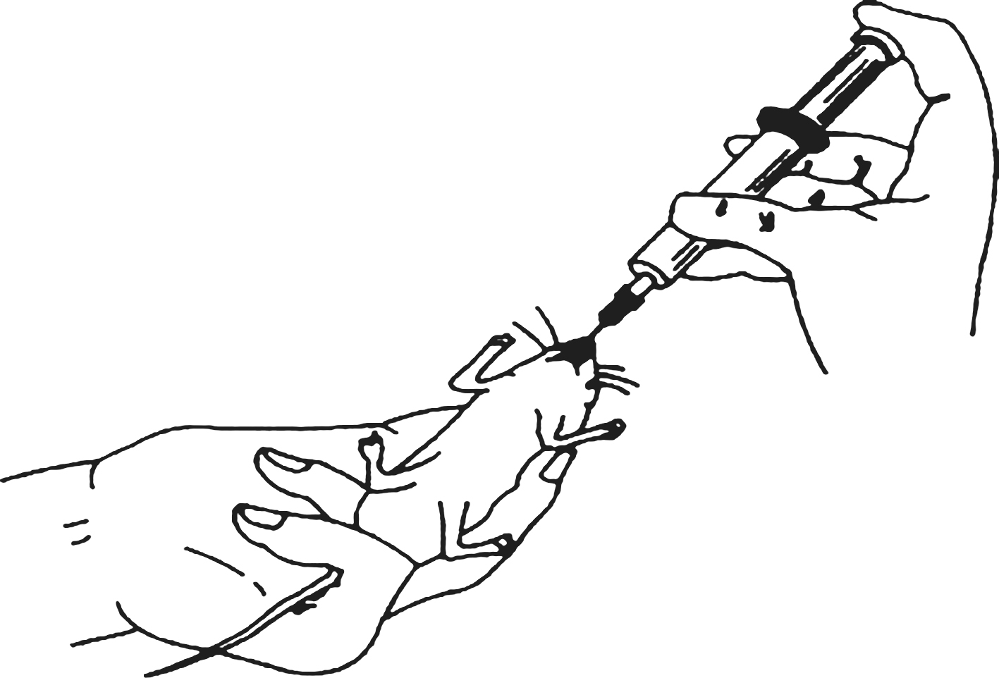 在处理好动物注射部位的皮肤后,左手将注射部位附近的皮肤提起,右手握住注射器,斜向刺入。刺入后左手放开皮肤,先用左手将针芯回抽,若无血液流入注射器则表明并未刺伤血管,则可将注射器针芯徐徐推进,将预定剂量的药物注入。若注射针头已刺伤血管,则应将针头拔出,重新注射。