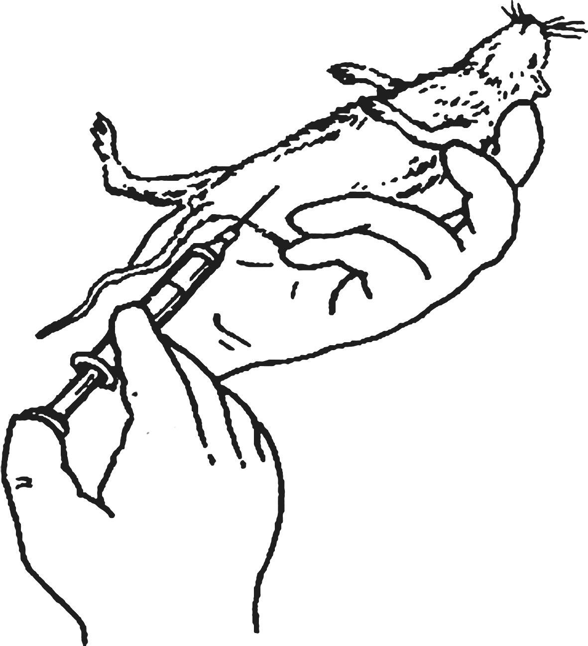 (1)小鼠 左手固定动物,使鼠腹部面向捉持者,鼠头略朝上。右手持注射器朝头部方向进行穿刺,注射针与皮肤面成45°刺入下腹部,针头刺入皮肤后进针3mm左右,当感到落空感时表示已进入腹腔,回抽无肠液、尿液后即可注射(图1-2-2-3)。注射量为0.1~0.2mL/10g。应注意切勿使针头向上注射,以防针头刺伤内脏。