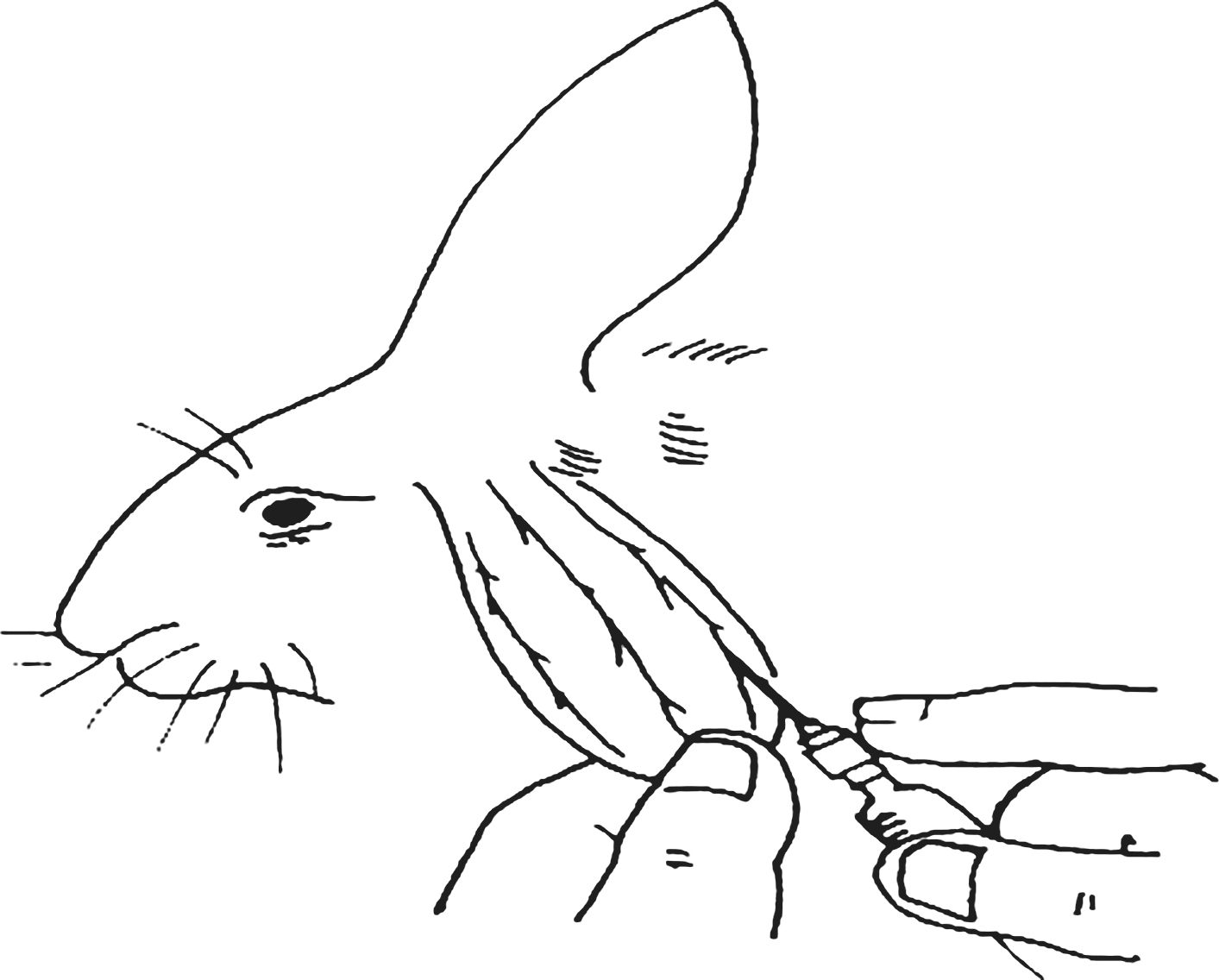 (3)家兔 一般采用耳缘静脉注射,兔耳缘静脉沿耳背后缘走行(图1-2-2-5)。将覆盖在静脉皮肤上的兔毛仔细拨去或剪去,可用水湿润局部,将兔耳略加搓揉或用手指轻弹血管,使兔耳血流增加,并在耳根压迫耳缘静脉,使其瘀血而发生血管怒张。注射者用左手食指和中指夹住静脉近心端,拇指和小指夹住耳缘部分,以左手无名指和小指放在耳下作垫,待静脉充盈后,右手持注射器使针头尽量由静脉末端刺入,顺血管方向平行、向心端刺1~1.5cm,放松左手拇指和食指对血管的压迫,右手试推注射器针芯,若注射阻力较大或出现局部肿胀,说明针头没有刺入静脉,应立即拔出针头;若推注阻力不大,可将药物徐徐注入。注射完毕后,与血管平行地将针头抽出,随即以棉球压迫针眼止血。