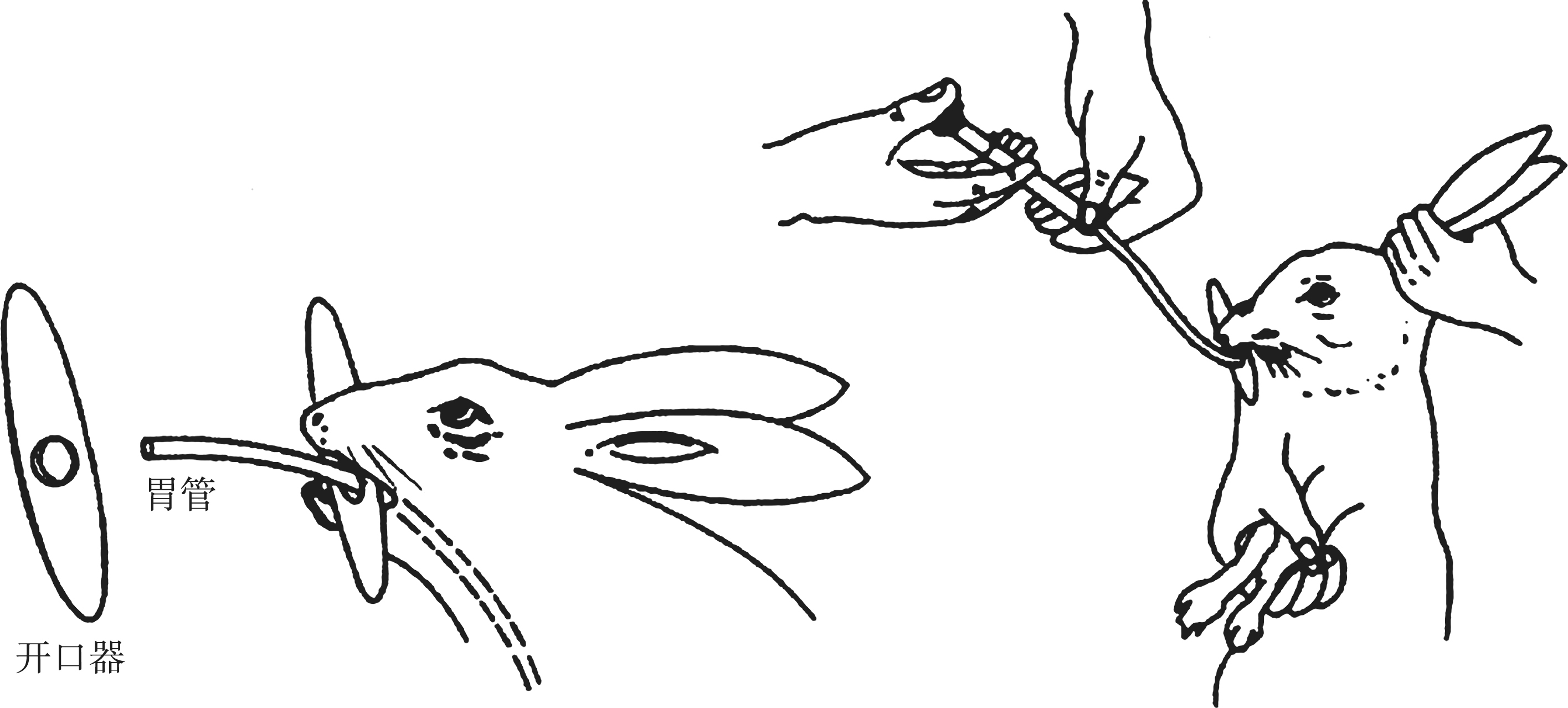 (3)家兔 用兔固定箱,可一人操作。如无固定箱,则需两人协作进行。一人坐好,腿上垫好围裙,将家兔的后肢夹于两腿间,左手抓住双耳,固定其头部,右手抓住其两前肢;另一人将开口器横置于家兔口中,把兔舌压在开口器下面(图1-2-2-2),将9号导尿管自开口器中央的小孔插入,慢慢沿上腭壁插入约15cm。插管完毕将胃管的外口端放入水杯中,切忌伸入水中过深,如有气泡从胃管逸出,说明胃管在气管内,应拔出重插。如无气泡逸出,则可将药物推入,并以少量清水冲洗胃管,以保证给药剂量的准确。灌胃完毕后,先退出胃管,后退出开口器。灌胃量为每次每只80~150mL。