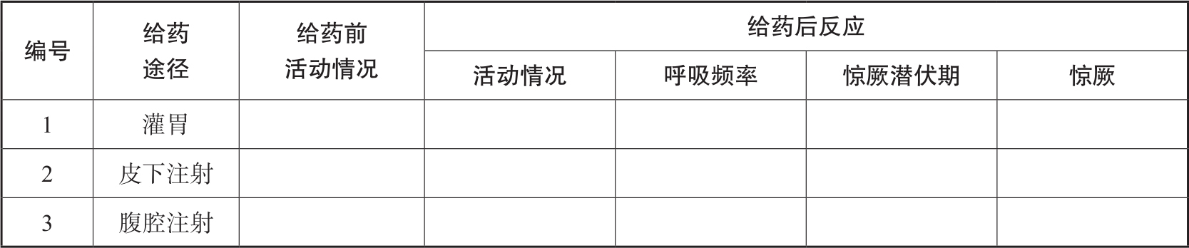 取性别相同、体重相近的小白鼠3只,称重、标记,观察并记录正常活动情况。分别对1、2、3号小白鼠采取灌胃、皮下注射、腹腔注射给药,均按0.2mL/10g给予2%尼可刹米,记录给药时间。观察小白鼠反应,记录动物从给药到首次出现惊厥的时间(药物作用的潜伏期)。