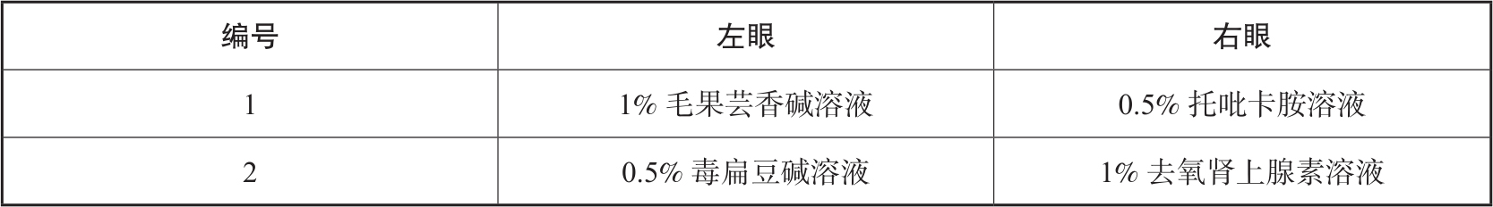 1%毛果芸香碱溶液、0.5%托吡卡胺溶液、0.5%毒扁豆碱溶液、1%去氧肾上腺素溶液。